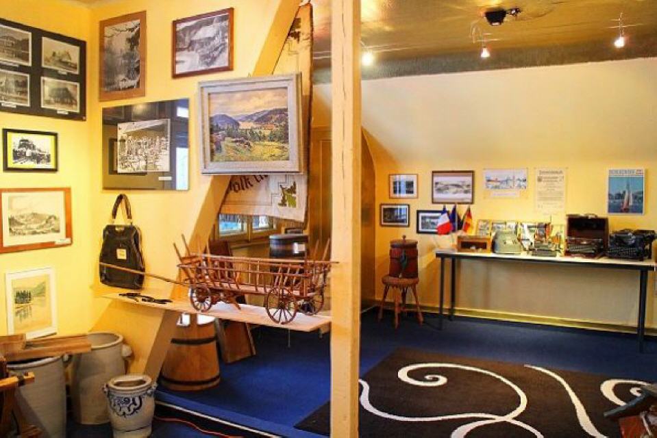 Wer etwas Zeit mibringt, dem werden Einblicke auf einen weiteren Stockwerk des alten Hauses gewährt. Dazu ruft sie allerdings Heinrich Kopp herbei. Der Schluchseer hat auf einer eigenen Etage ein kleines Heimatmuseum eingerichtet. Wenngleich sie nicht so recht den Begriff “Museum” mögen und eher von einer “Sammlung” sprechen, so zeigen die Räume doch mehr. Zahllose Exponate aus der Geschichte Schluchsees sind hier vertreten, darunter sogar eine uralte Schulbank mitsamt den damaligen Karten, Klassenbüchern und Fotos. In einem anderen Raum sind Gebrauchsgegenstände aus der Anfangszeit des vorigen Jahrhunderts zu bewundern. In einem Glasschrank hütet Heinrich Kopp der die Exponate zusammengetragen hat, alte Fotoapparate, wie sie damals die Urlauber, die “Sommerfrischler”, hierher nach Schluchsee brachten. Spielzeug, Puppenstuben und vielerlei andere weitere Kostbarkeiten lassen den Betrachter staunen und alte Erinnerungen wach werden.