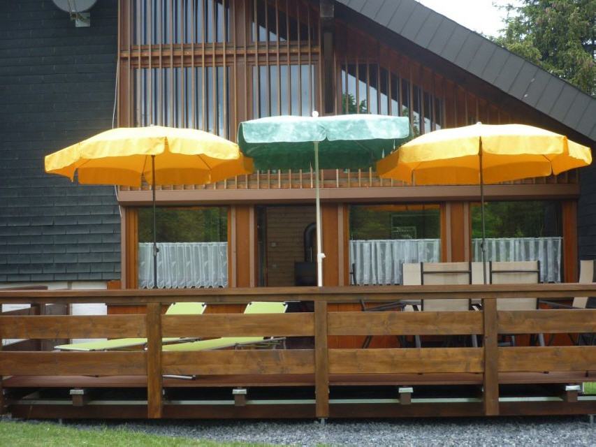 Auf der mit einem Geländer umschlossenen neuen Terasse finden Sie 3 Sonnenschirme, eine Sitzgruppe, Liegestühle und ein verriegelbares Gatter.