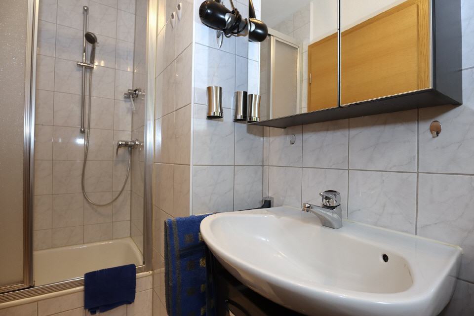 Bad: Waschbecken mit Spiegelschrank, Haartrockner und Kosmetikspiegel