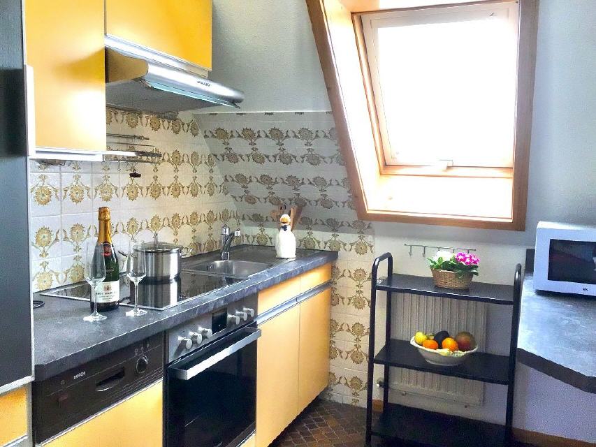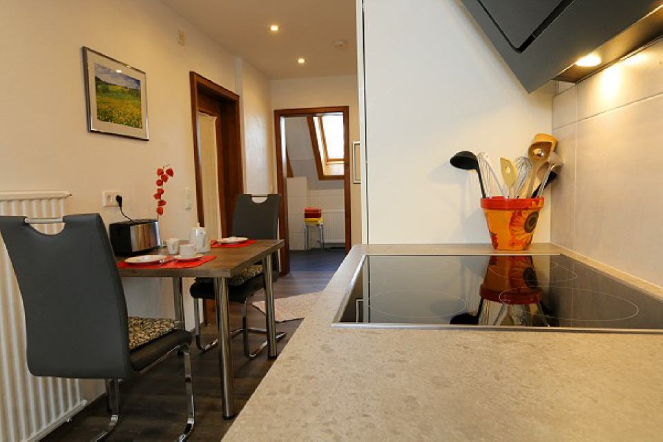 Küche mit Essplatz, Elektroherd, Dunstabzug, Backofen, Mikrowelle, Spülmaschine, Kühlschrank mit Gefrierfach, Handmixer, Eierkocher, Toaster, Wasserkocher und Kaffeemaschine.