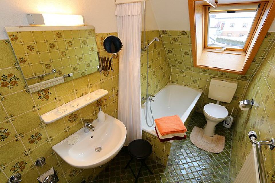 Bad/Dusche, WC, Föhn, Kosmetikspiegel.