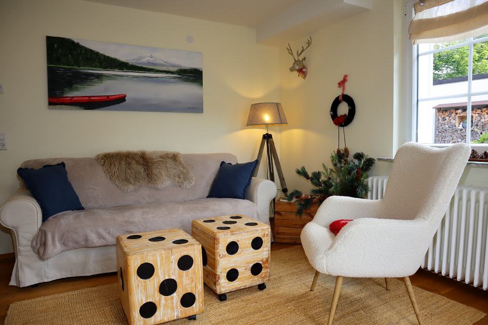 - Wohnzimmer / Unterhaltung; 23 qm Wohnfläche, 2er-Sofa, 3er-Sofa, Brettspiele, offener Kamin, Radio, TV, TV-Flachbildschirm, TV-Sat