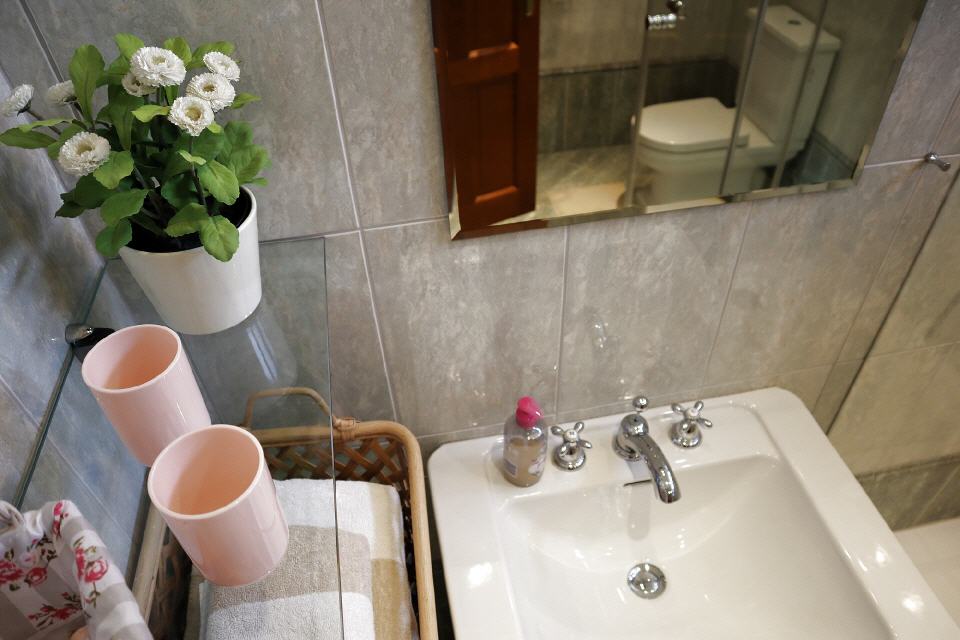 - Badezimmer 3: 2 qm, Gäste-WC, Spiegel, Toilettenpapier, Waschbecken, WC