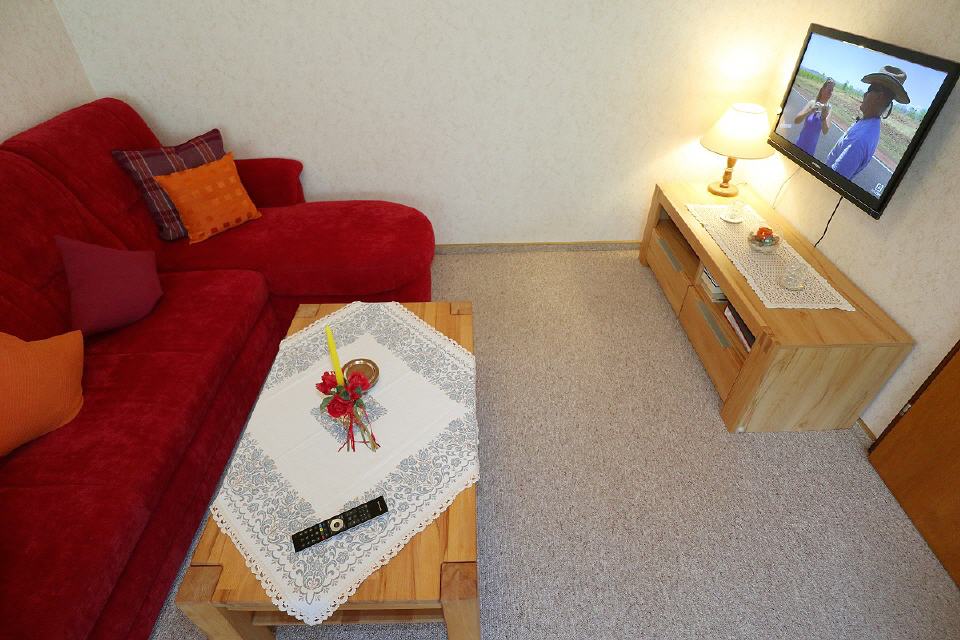 • Wohnzimmer Schlafcouch, gemütliche Sitzgarnitur, Schrank, TV, Radio, Spielesammlung