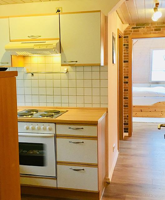 - Kochnische mit Elektroherd, Backofen, Geschirrausstattung, Kaffeemaschine,