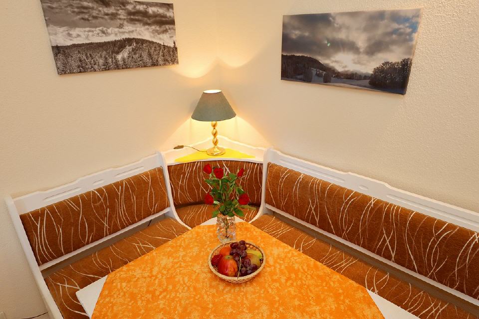 Von unserem Frühstücksraum haben Sie eine wunderschöne Aussicht auf Wiesen und Wälder. Morgens erwartet Sie ein reichhaltiges Frühstücksbüffet, das neben verschiedenen selbst gebackenen Brotsorten, Brötchen und Kaffee auch Müsli, Quark und andere Leckereien bereithält.