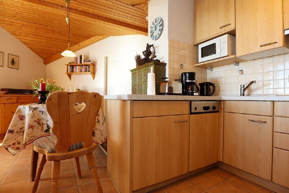 • komplett eingerichtete Küchenzeile unter anderem mit Kaffeemaschine, Wasserkocher, 4-Feld-Glaskeramik-Herd, Mikrowelle, Spülmaschine, Kühlschrank mit 3-Sterne-Gefrierfach