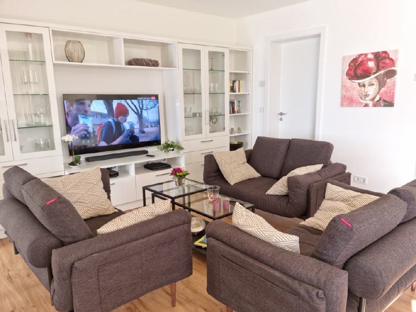 Die bequeme Couchgarnitur mit 3 Schlafsofas bietet Ihnen hier den richtigen Platz zum Chill-out. Hier finden Sie genügend Platz zum Sitzen, Liegen und Entspannen. Sie werden sich hier vor der eleganten weißen Vitrinen-Schrankwand und dem exklusiven Smart-TV/Home Cinema-Entertainment-Equipment so richtig wohl fühlen und Ihren Urlaub genießen. Außerdem schmückt ein Sideboard mit schöner Dekoration den Raum. Hier steht Ihnen ein Speedphone-Telefon mit Babyphone-Funktion zur Verfügung. Im Essbereich finden an dem massiven Landhaus-Eichentisch 6 Personen ganz bequem Platz. Genießen Sie hier gesellige Abende in gemütlicher Runde. Die direkt an den Essbereich anschließende moderne, komplett ausgestattete Luxus-Küche lässt keine Wünsche offen. Ihnen stehen neben sämtlichen Küchenutensilien ein Ceran-Kochfeld mit direktem Dunstabzug, ein Multifunktionsbackofen, ein Mikrowellenherd sowie eine Kühl-Gefrier-Kombination und ein Geschirrspüler zur Verfügung – alles wertige Markengeräte von Bosch und Constructa.