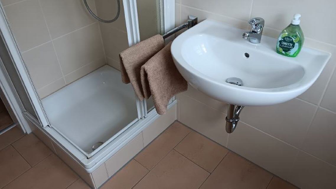 Das Bad bietet Dusche und WC. Fön und Handtücher sind vorhanden.