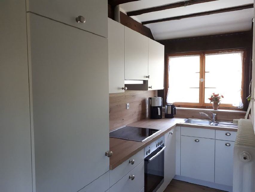 Die Küche ist komplett ausgestattet: Elektroherd mit Backofen, Kühlschrank mit Gefrierfach, Geschirrspüler, Mikrowelle, Kaffeemaschine, Wasserkocher, Toaster, Handrührgerät.