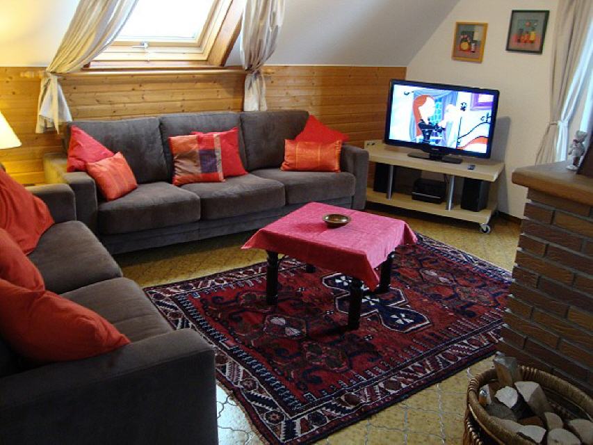 Wohnung 2: 70 qm Wohnfläche, Wohnzimmer mit Kamin, zwei Schlafzimmer für je zwei Personen, Küche, Bad mit Dusche und WC