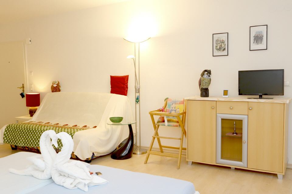 - Wohnbereich: Schlafsofa, Esstisch, TV Digital