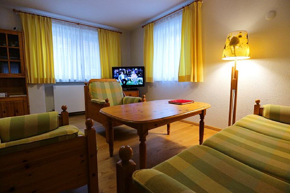 ein Wohnzimmer mit Kachelofen und TV;