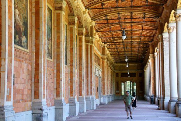 Vom Kurgarten erstreckt sich in einem Bogen längs der Oos die Kaiserallee. An ihr liegt hinter riesigen Platanen die Trinkhalle. Ein Hauch von südlichem Flair überkommt den Besucher beim Anblick dieses Gebäudes. Der Zauber von Licht und Schatten gibt dem 9o Meter langen Wandelgang mit den korinthischen Säulen und den 14 großflächigen Wandgemälden badischer Sagen zu jeder Jahreszeit seine vollendete besondere Schönheit.
