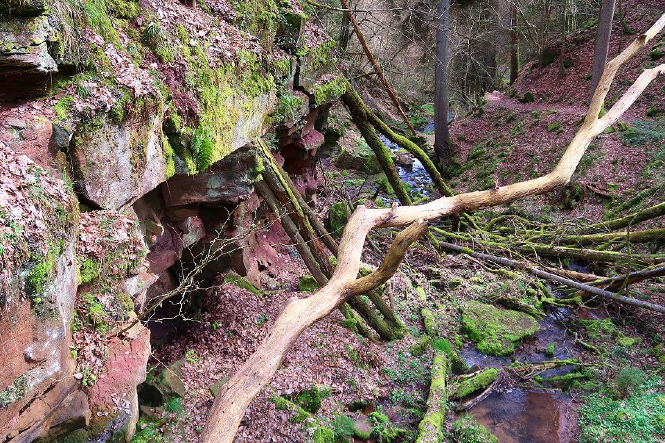 Ein Stück weiter führt eine Brücke von einer Talseite zur anderen. Hier steht harter Geröllsandstein an. Für den Bach ist es sehr mühevoll, sich in ihn einzutiefen. Unterhalb davon, im weicheren Badischen Bausandstein, hat der Bach es deutlich leichter: Hier konnte er ein breiteres Tal in die Steine hinein graben. Viele Pflanzen fühlen sich hier wohl - es sind vor allem verschiedene Farnarten, die an den Felsen wachsen. Sonnenstrahlen erreichen die Schlucht nur spärlich, dazu kommt eine hohe Luftfeuchtigkeit auch wegen der vielen Quellen und des Baches. Es bilden sich feuchtkühle Mikroklimate. Sie sind ideal zum Beispiel für den Braunstieligen Streifenfarn (Asplenium trichomanes), der sich vor allem in Gesteinsklüften wohlfühlt. Dort sammelt sich ein wenig Humus, der Nährstoffe und Wasser festhält. Der sich einschneidende Bach stößt immer wieder auf besonders harte Geröllsandsteinbänke. An diesen Widerständen bilden sich kleine Wasserfälle und Stromschnellen.