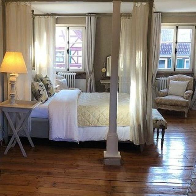 In unserem denkmalgeschützten Fachwerkhaus aus dem Jahr 1713 ist Unvollkommenheit ein Merkmal und doch charakteristisches Ambiente: Die Wände sind nicht immer gerade, die Türen und alten Dielenböden können manchmal etwas knarzen und die ein oder andere Tür etwas niedriger sein, als heute üblich. Antike französische Möbel, die originalen Holzbalken und detailverliebte Dekorationen fügen sich perfekt ins Bild und sorgen für einen ganz besonderen Charme.