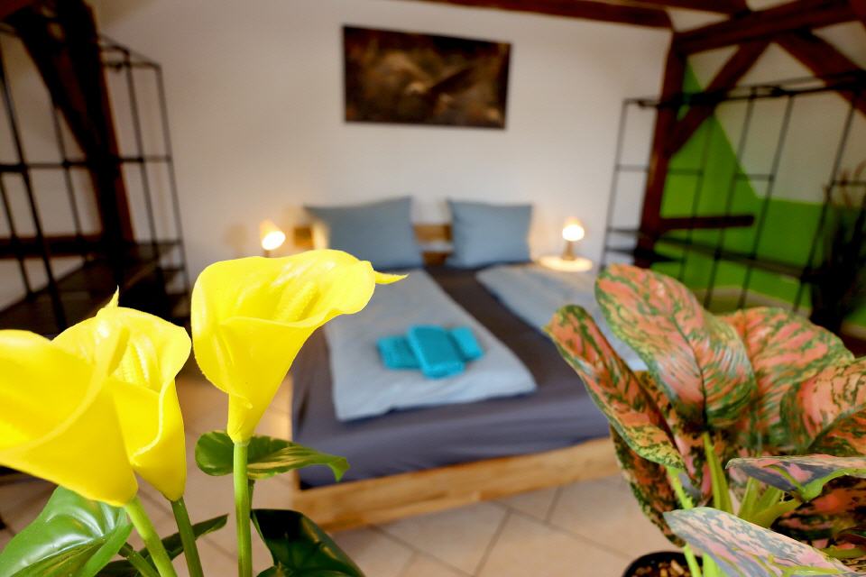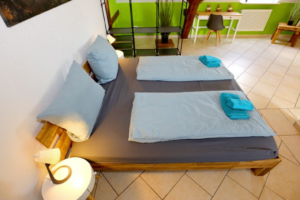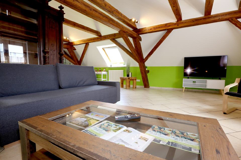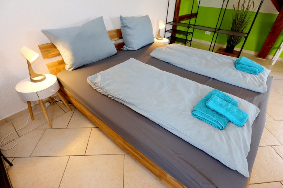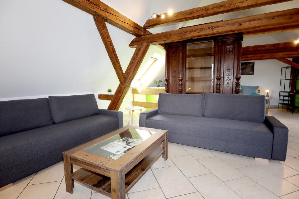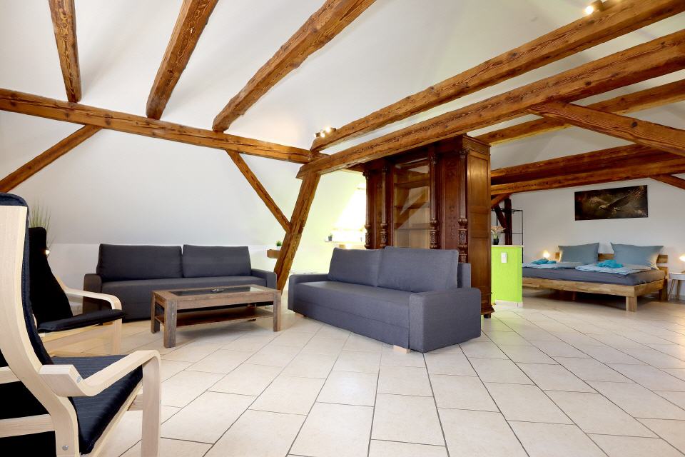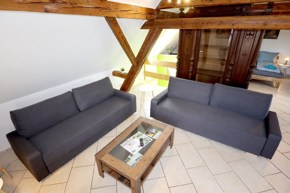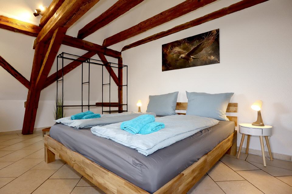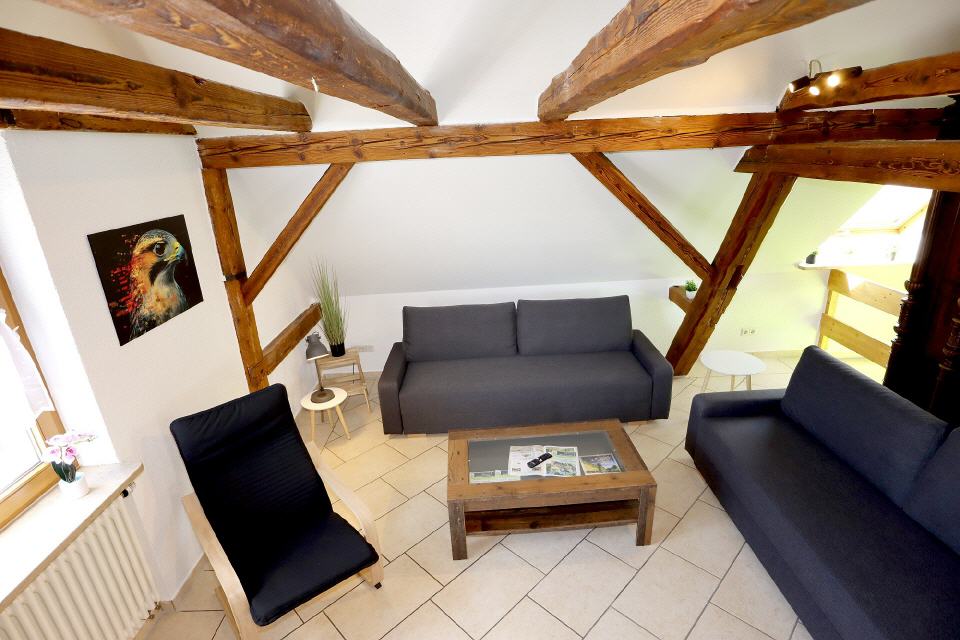 Die Ferienwohnung Falkenburg Loft bietet insgesamt drei Doppelbetten: je eines in zwei separaten Schlafzimmern und ein weiteres in der offenen Galerie. Zusätzlich steht im Wohnzimmer (Galerie) ein Schlafsofa für zwei Personen zur Verfügung – so finden hier bequem bis zu 8 Personen Platz.