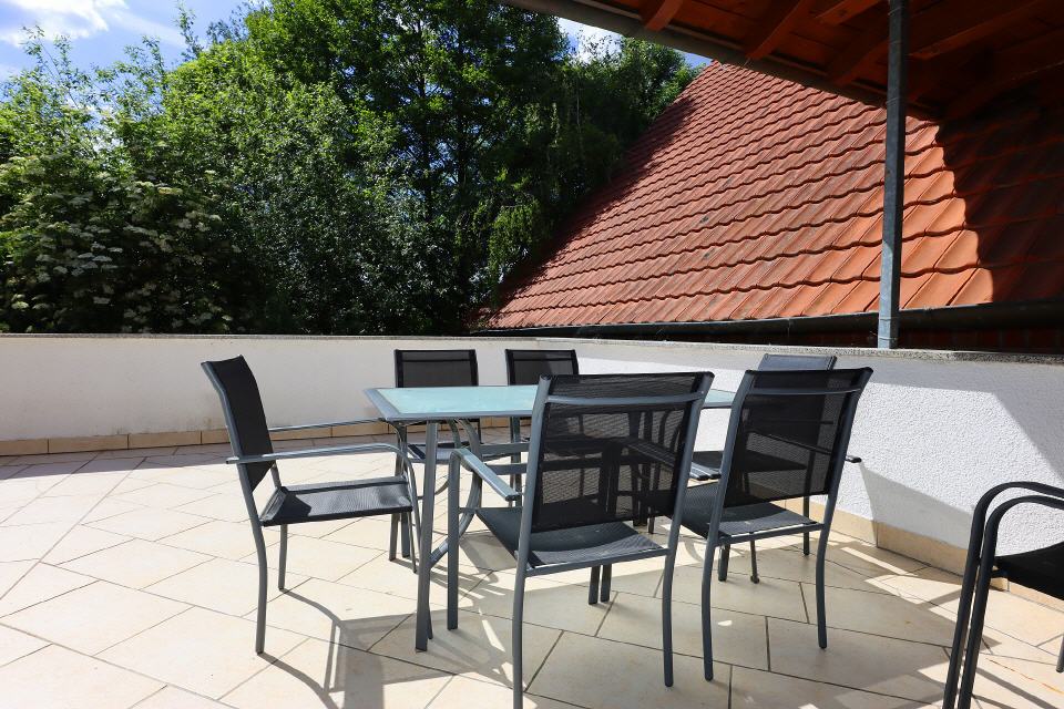 Der große Süd-West-Balkon (teils überdacht) lädt bis in die Abendstunden zum Verweilen ein – perfekt für lauschige Sommerabende. Die umliegenden Gärten sorgen für Privatsphäre und bieten viel Platz zum Durchatmen.