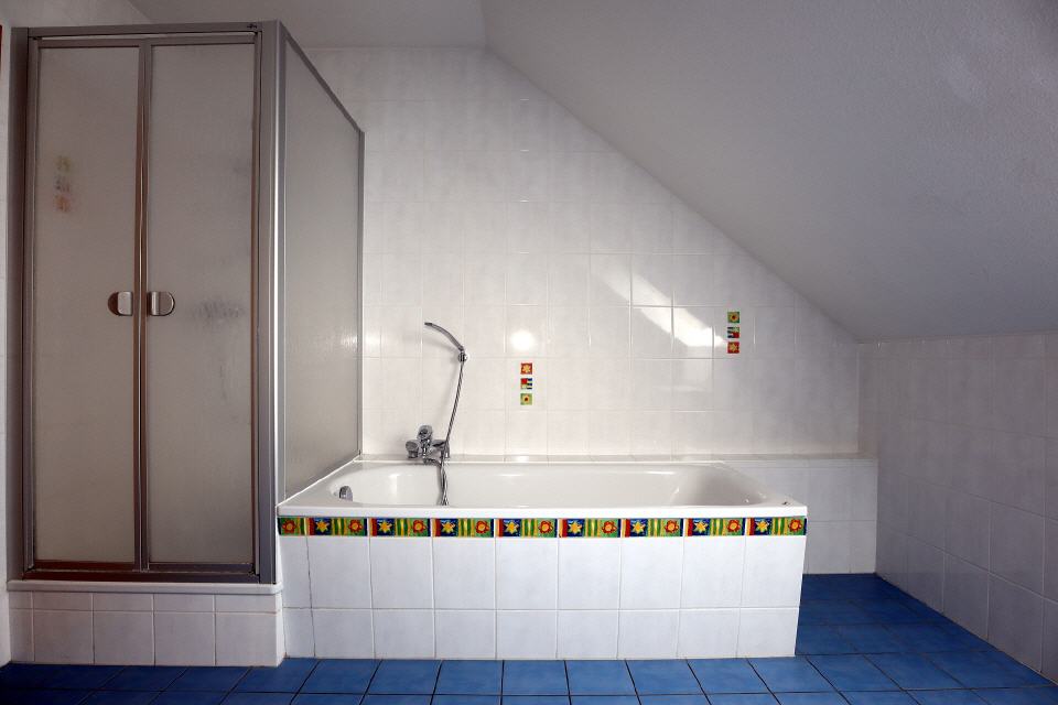 - Sanitär: Föhn, Badewanne, Waschbecken, Dusche, Badetücher, Spiegel, WC, Handtücher