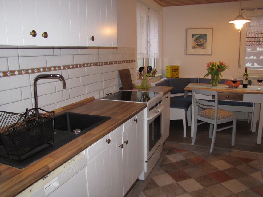Voll ausgestattete Küche mit Elektroherd (Cerankochfeld), Backofen, Dunstabzug, Kühlschrank, Toaster, Kaffeemaschine, Wasserkocher, Spülmaschine, ausreichend Geschirr und Besteck für 4 Personen und gemütlichem Essbereich.