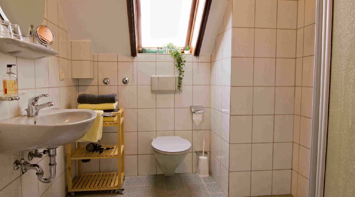 1 Badezimmer mit Dusche, Waschbecken und WC