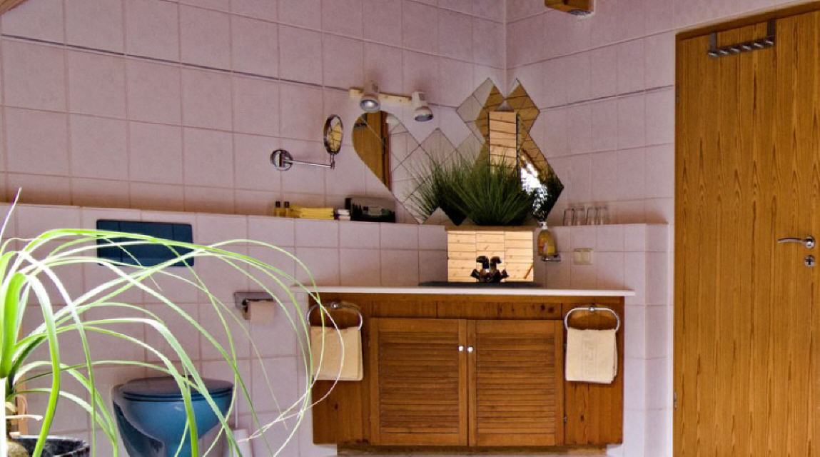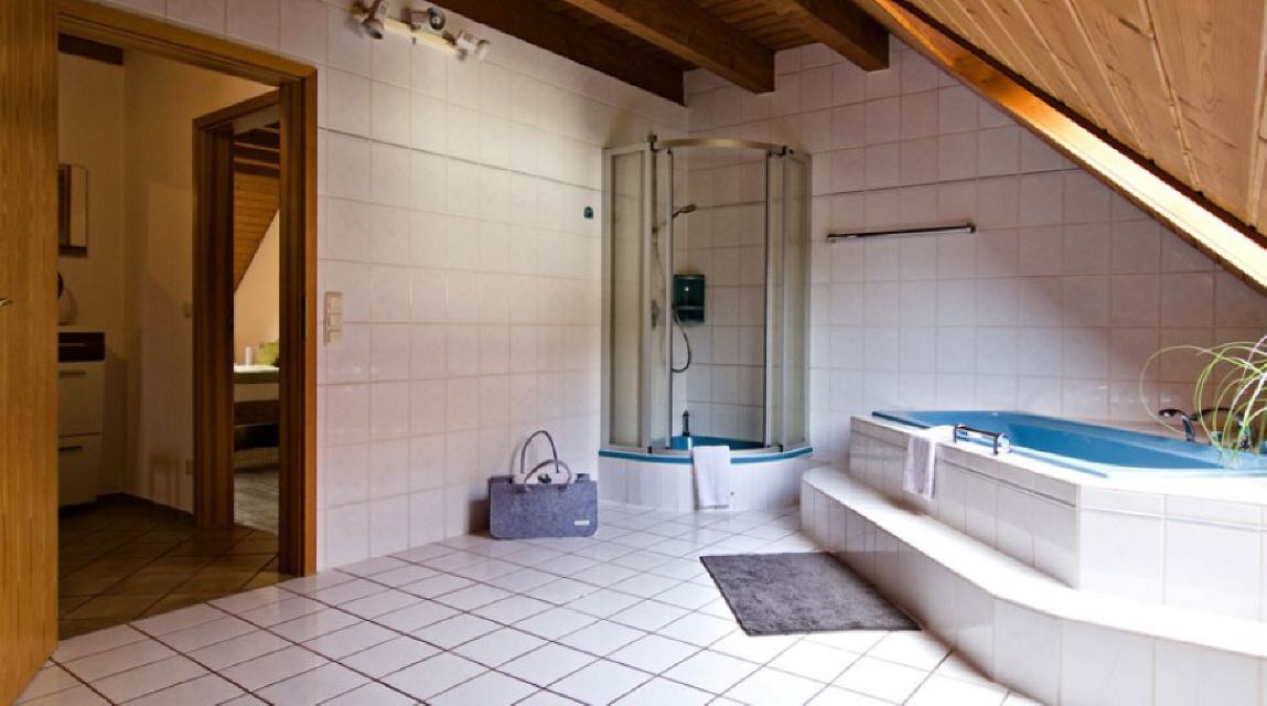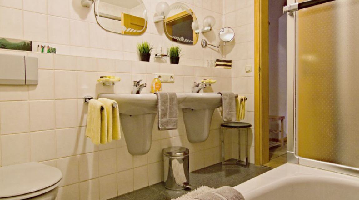 1 Badezimmer mit Badewanne, Dusche, 2 Waschbecken und WC