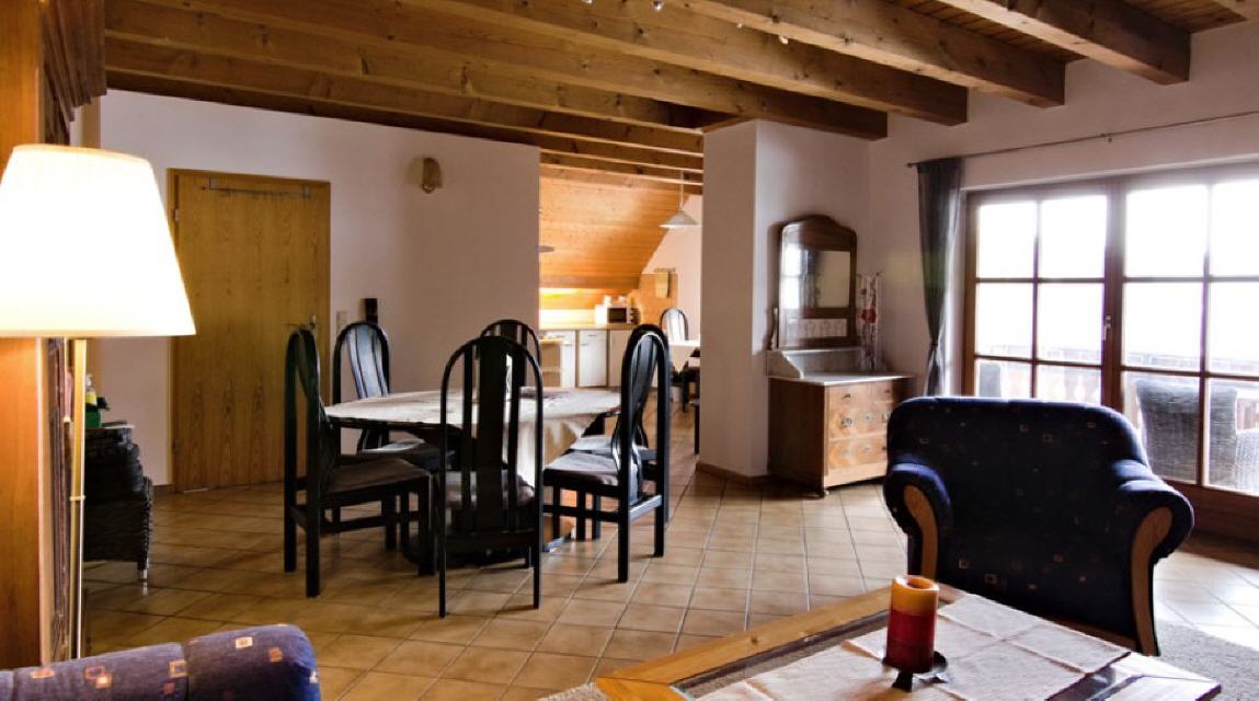 1 großer Wohnraum mit Esstisch, Stühlen, Couch, Sesseln und TV