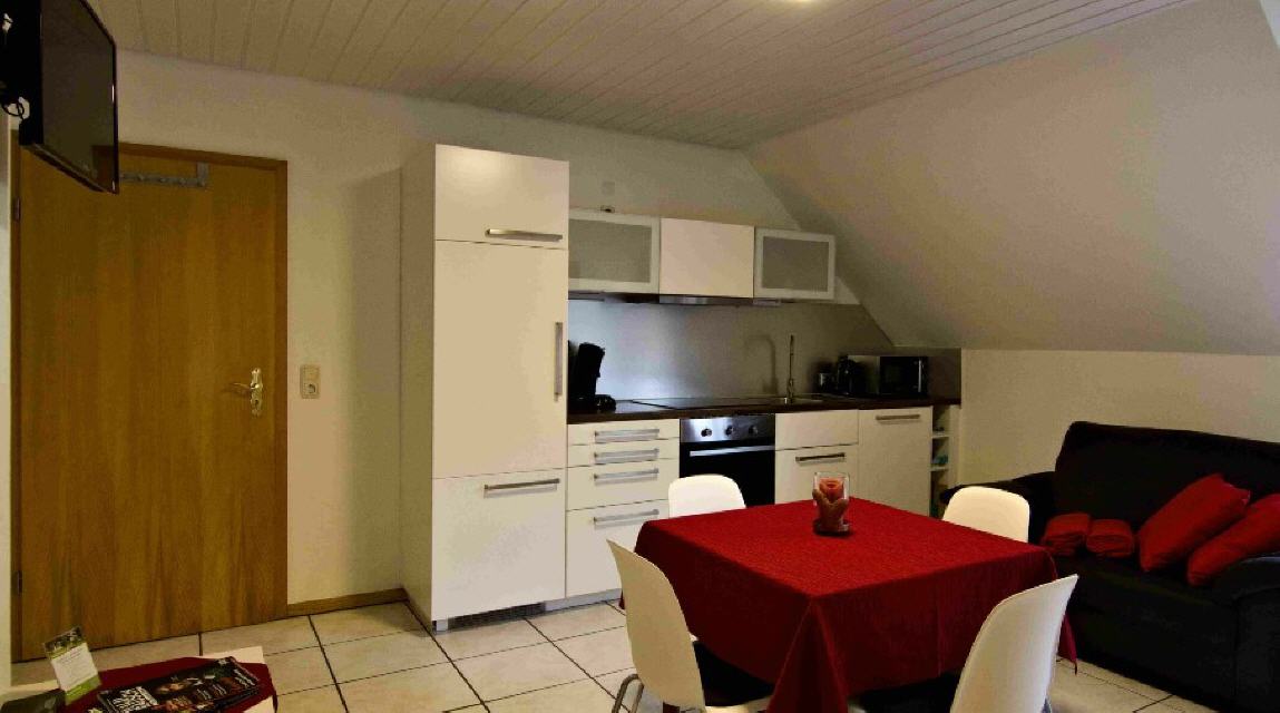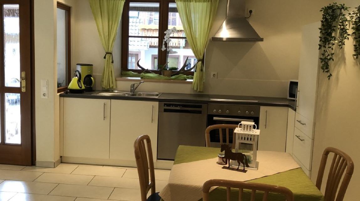 1 Wohnküche mit Küchenzeile, Esstisch, Eckbank und Stühle