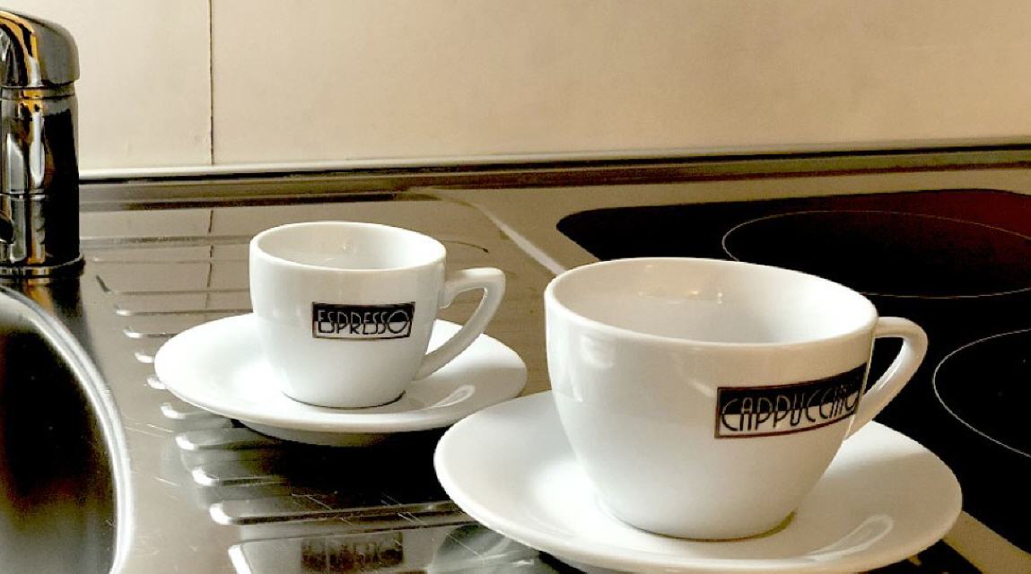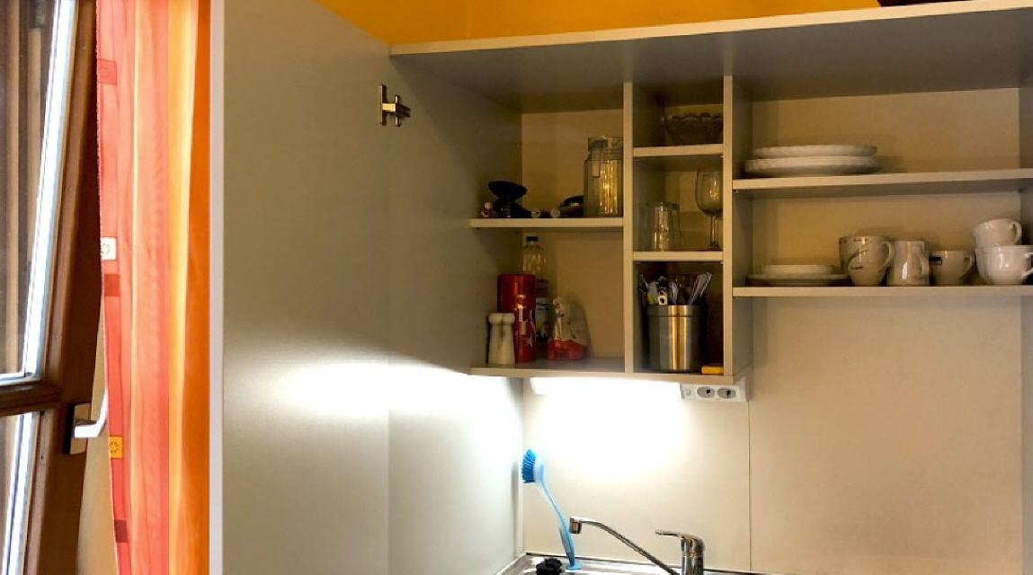 Kühlschrank, Mikrowelle, Induktionskochfeld, Kaffeemaschine, Wasserkocher, Stauraum