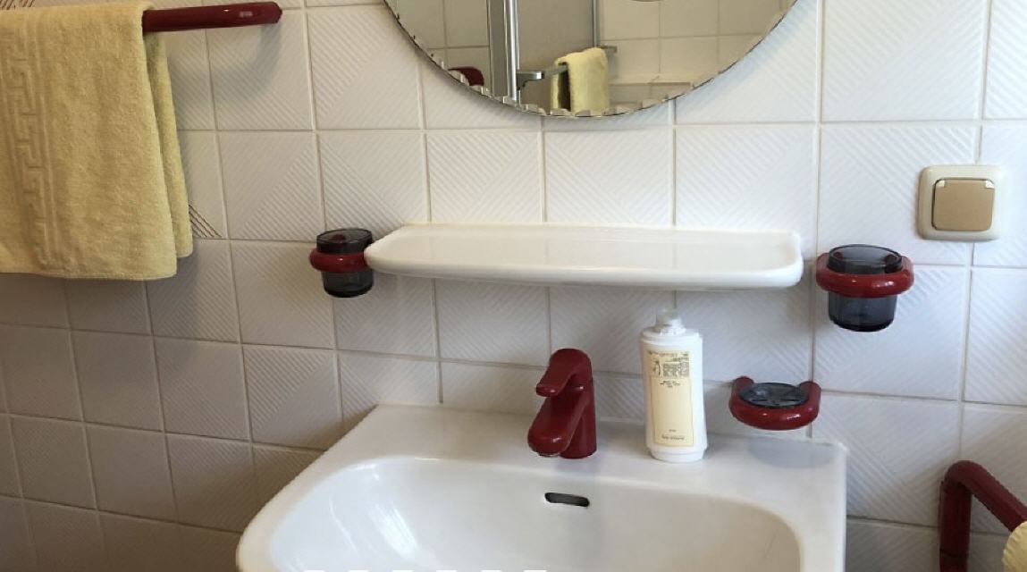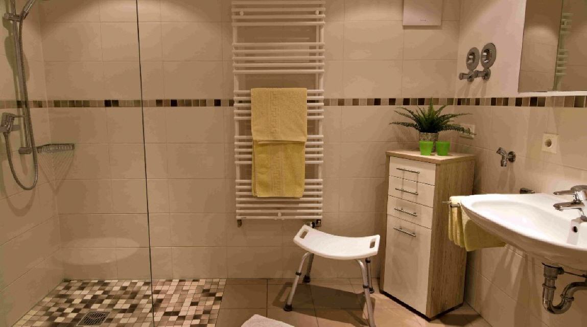 1 barrierefreies Badezimmer mit Dusche, Waschbecken und WC