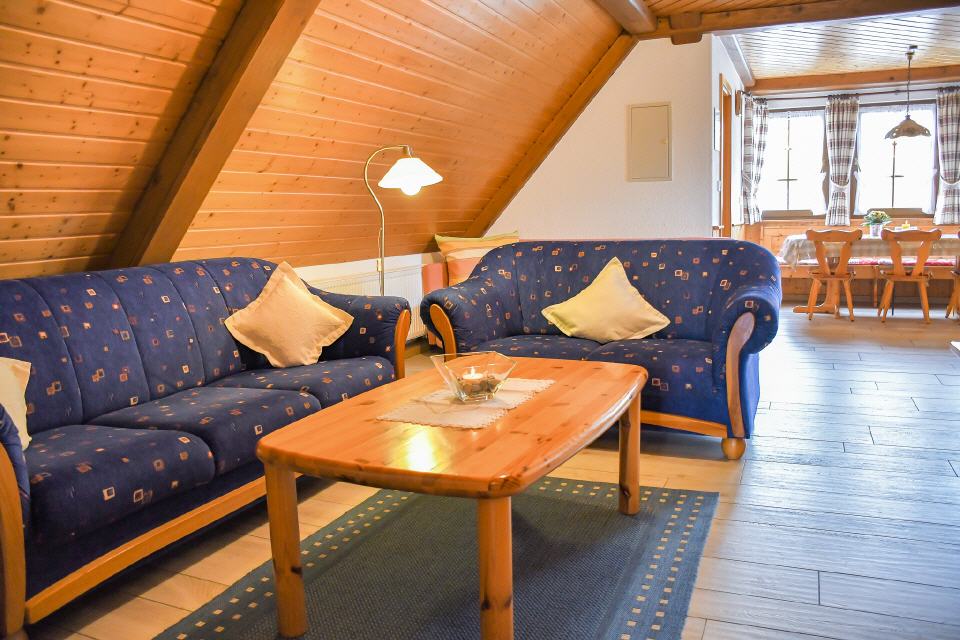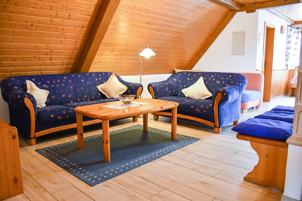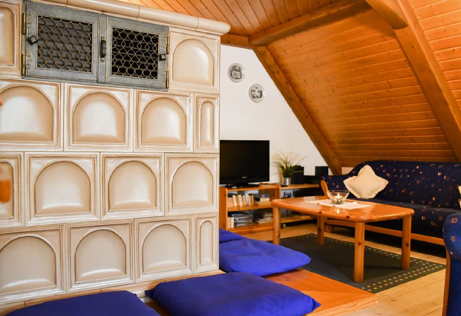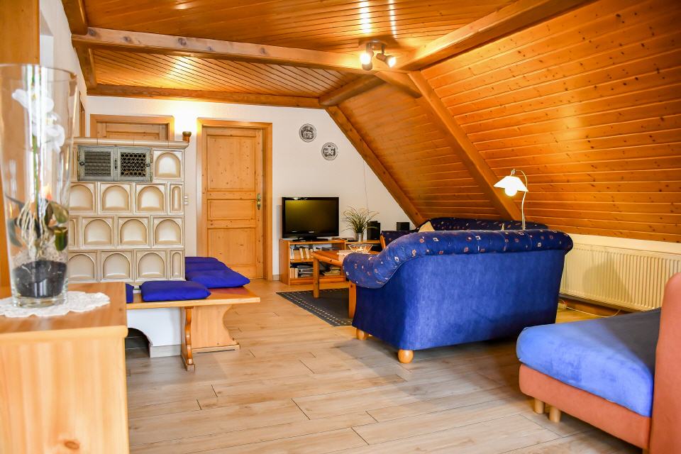 Die Wohnung (Dachgeschoss) ist sehr großzügig angelegt (ca. 75 qm) und bietet Platz für bis zu 4 Personen. Beheizt wird die Wohnung über einen mit Holz befeuerten Kachelofen, welcher der Wohnung eine ganz besondere Atmosphäre verleiht. Die Wohnung besteht aus einem großen Wohnzimmer, Küche, Bad mit Dusche und WC, einem Doppelzimmer und einem Dreibettzimmer. Eine weitere Schlafmöglichkeit bietet sich auf einer Wohn- / Schlafcouch im Wohnzimmer. Zur Wohnung gehört eine Terrasse mit einer Sitzgarnitur, Gartenmöbel sind auch vorhanden. Ein TV-Gerät mit Satellitenanschluss steht zur Verfügung.