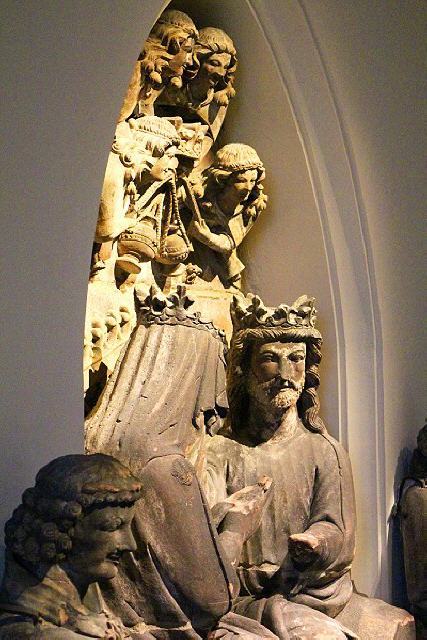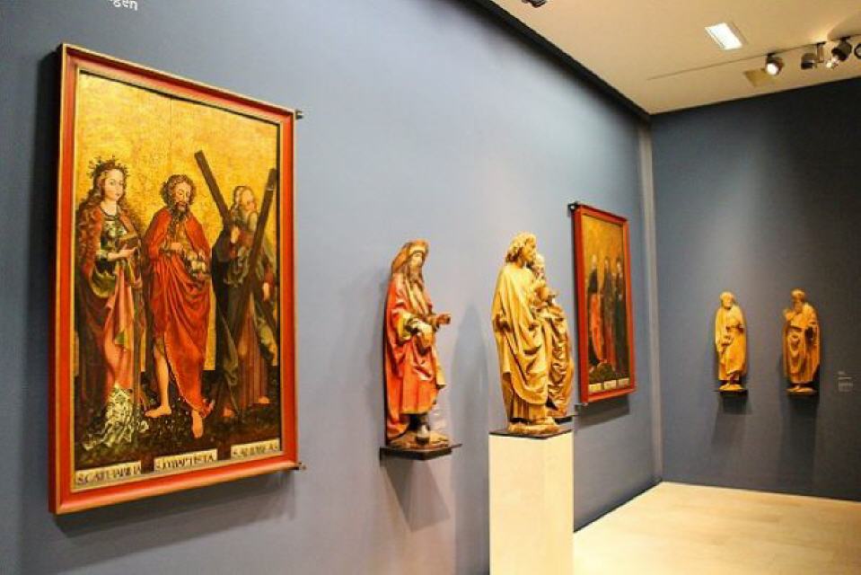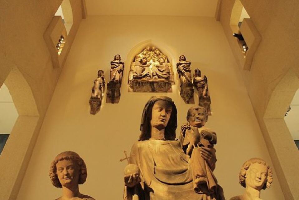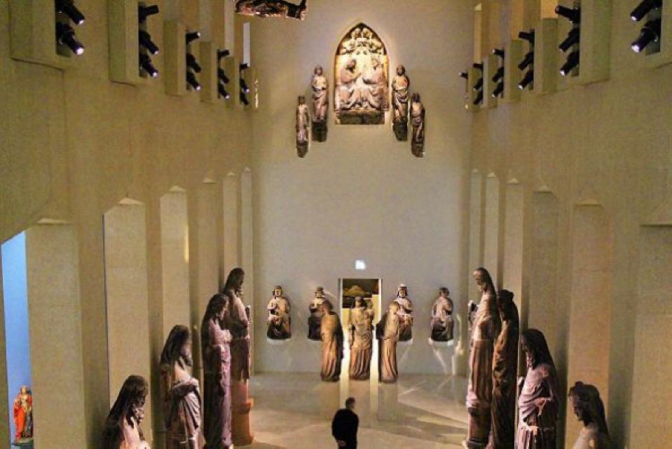 In dem von Mäckler umgebauten Kirchengebäude befindet sich eine Skulpturenhalle, deren Mittelraum den steinernen Originalfiguren des Freiburger Münsters vorbehalten bleibt. Tafelmalerei und Holzskulpturen umrahmen die Halle in Kabinetten im Parterre und auf der Galerie im Obergeschoss. Hier sind Werke vonMatthias Grünewald, Lucas Cranach der Ältere, Martin Schaffner und Hans Baldungebenso zu finden, wie der „Christus auf dem Esel“ (1350/60) oder der Passionsaltar des Hausbuchmeisters (um 1480).
