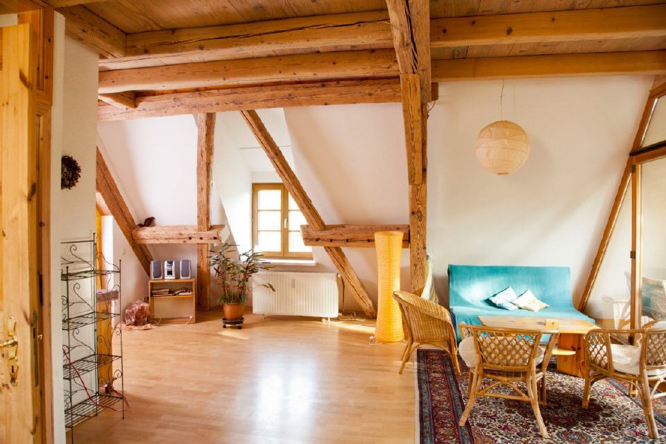 Details und Ausstattung: Liebevoll renovierte alte Balken sowie die Küche und Möbel aus Vollholz prägen unsere Nichtraucherwohnung.
