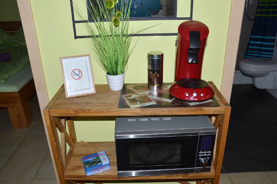 Kühlschrank mit Tiefkühlfach, Herd mit zwei Kochfeldern, Pad-Kaffemaschine, Toaster, Mikrowelle (kein Backofen) Wasserkocher, komplette Kücheneinrichtung mit Geschirr, Besteck, Kochtöpfen usw.