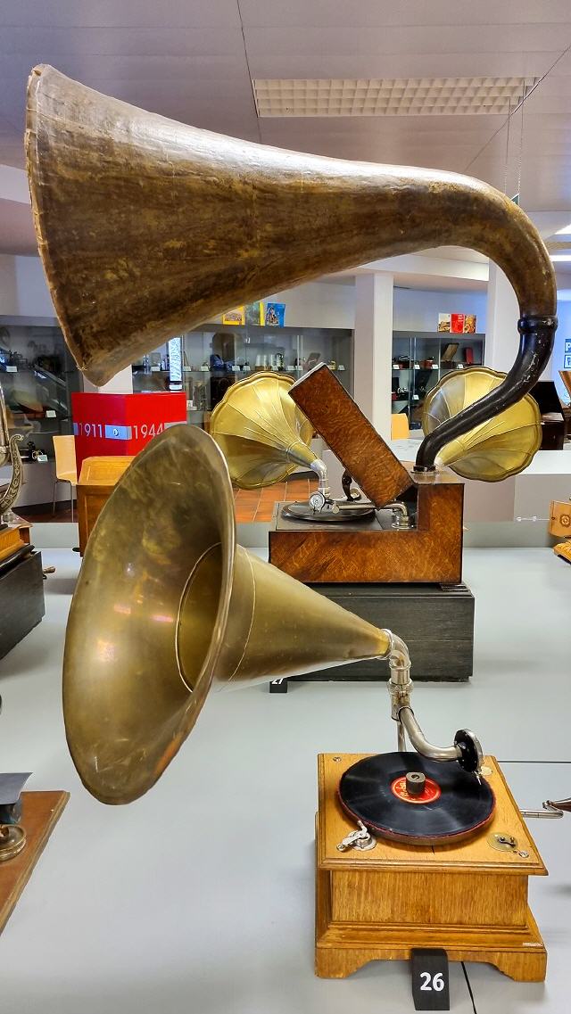 Mit diversen Phonographen, Trichter-, Schatullen-, Koffer- und “Salon”-Grammophonen, mechanischen und elektrischen Antrieben, elektrischen Tonabnehmern und deren Wiedergabegeräten, Plattenwechslern für Schellacks, dem “Ur”Tefifon, Musikbox, Phono-Koffern, den ersten HiFi-Stereoanlagen bis zu den High-Tech-Plattenspielern der 1980er Jahre und deren “Überkopf” -Demonstration wird die an Kuriositäten reiche Entwicklungsgeschichte der Phono-Technik dargestellt.