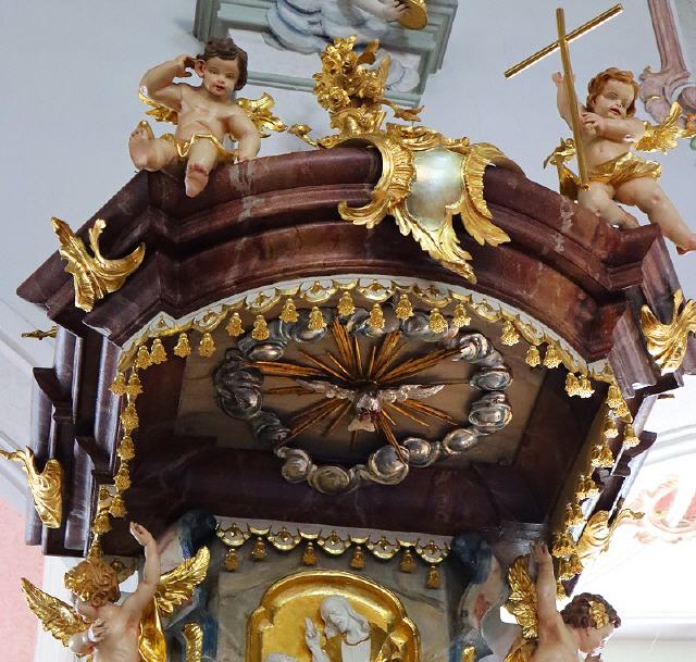 Das Wappen der Gemeinde zeigt in Silber aus einer goldenen Mondsichel wachsend die Mutter Gottes, in der linken Hand das Jesuskind tragend, in der rechten Hand ein Zepter. Die Ortsfarben der Gemeinde sind rot-weiß.