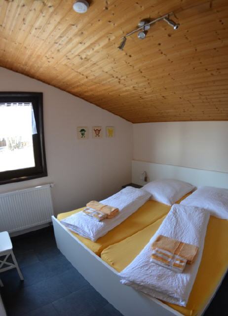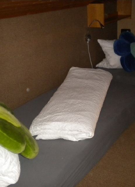 - Koje im 2. Stock: 2 Matrazen, Bettdecken und Kissen, 1 Herrendiener, Dachgaupen mit Fenstern, Rolladen zur Verdunkelung