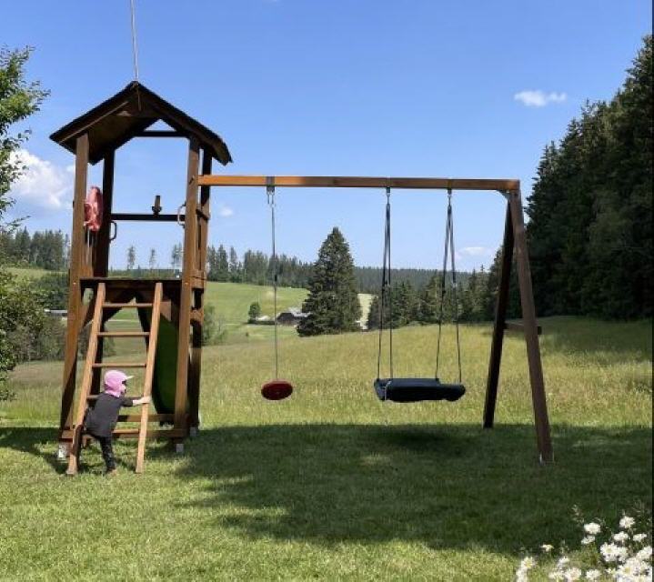 Spielturm mit Schaukeln, Sandkasten, Rutsche plus Trampolin. Auf unserem Spielplatz gibt es eine Schaukel für die Kleinen und eine entspannte Liegeschaukel, in welcher man toll in die Wolken schauen kann. Außerdem gibt es eine Rutsche und einen Sandkasten. Ganz neu haben wir ein InGround Trampolin.