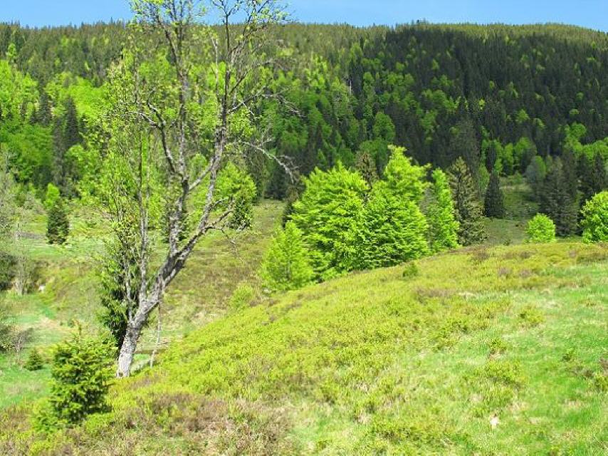 Halbrechts abbiegend folgen wir dem Schwarzbergweg (Richtung Zweiseenblick). Es geht bergan und wird steinig und ein wenig rauer. Ein Weg, wie ihn die Ziegen lieben und wer weiß, vielleicht sind ja auch Wald-Wuseli zu entdecken?! Wir folgen dem Pfad, die Landschaft öffnet sich und der Blick geht zu den End-Moränen des ehemaligen Feldberg-Gletschers der hier an die 400 m hoch alles überdeckte.
