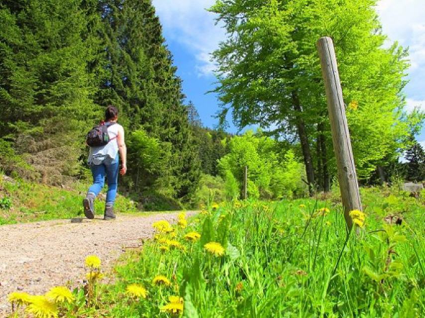 Beginnend am Mösle-Parkplatz (880 m) geht es, nachdem wir die Menzenschwander Alb überquert haben, kurz durchs Hinterdorf, vorbei an typischen Schwarzwaldhöfen. Am Schwarzbergweg biegen wir links ab und gehen das Asphaltsträßchen bis zum Ende bergauf. Nun folgen wir einem schmalen Pfad. Auf halber Talhöhe folgen wir dem Wildapfelpfad. Nach wenigen Metern sehen wir im Westen ins Krunkelbachtal und in der Ferne das Herzogenhorn (1415 m). Die höchste Erhebung im Landkreis Waldshut. Denn dieser Zipfel am Feldbergmassiv gehört politisch zum Landkreis am Hochrhein. Gleich oberhalb beginnt der Breisgau-Hochschwarzwald.
