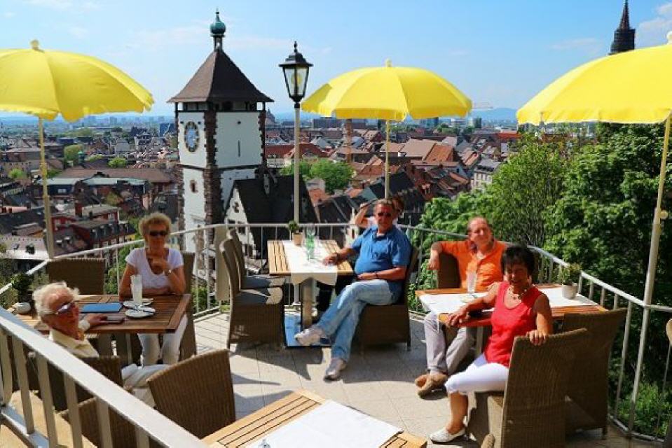 Sitzbänke, eine üppige Sonnenliege sowie Grillstellen laden zum Verweilen ein. Ein Stück weiter bietet sich beim beim Martinsfels kurz vor Erreichen des Roßkopf (737 m) nochmals eine fantastische Aussicht ins nördliche Breisgau. Zu sehen sind Denzlingen, Emmendingen sowie die Hochburg bei Sexau und sogar Freiamt im Schwarzwald. Von nun an führt der Weg nur noch steil bergab bis zum Kanonenplatz am Freiburger Schlossberg. Bevor es durch die Stadt und weiter zum Bahnhof geht, sollten Sie hier am Schlossplatz eine Rast einlegen und das herrliche Panorama mit dem Freiburger Münster und den am Horizont liegenden Kaiserstuhl sowie die Vogesen genießen.