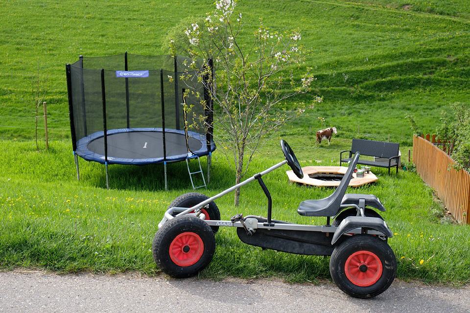 Daneben gibt es einen Sandkasten, eine Schaukel, eine Rutsche, eine Turnstange und ein Basketballkorb, aber auch einen Heuschober zum Herumtoben. Gerne können Kinder auch im nur 50 Meter entfernten Bach spielen. Manchmal sieht man darin sogar eine Forelle vorbeihuschen. Wenn’s die Zeit auf dem Bauernhof zulässt, können die Kinder gerne auch auf dem Traktor mitfahren. Da gibt es viel zu sehen und rings um den Hof herum zu entdecken.