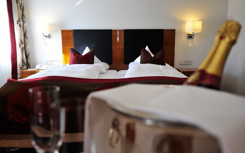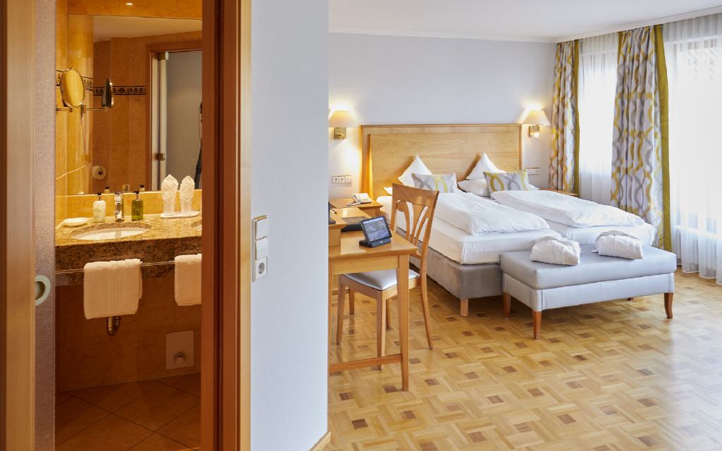 Doppelzimmer Münstertal. Doppelzimmer 42 qm, Balkon 8 qm, Waldseite mit Morgensonne. Der dezent-exquisite Einrichtungsstil gibt auch hier den Ton an: Harmonische Leichtigkeit in einer warmen Atmosphäre sorgt für Erholung ab dem ersten Augenblick. Der große Balkon lädt zum Frühstück in der Morgensonne ein und verspricht an heißen Sommertagen angenehme Kühle. Besondere Ausstattungsmerkmale: zum Teil überlange Betten (210 x 180 cm), separate Toilette und begehbare Ankleide.