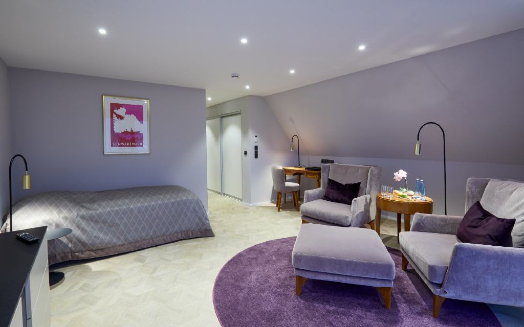 Suite Dreisamtal. Exklusive Suite 55 qm, Balkon 6 qm, Südwestseite zum Garten. Die Dreisam-Tal-Suiten versprichen ein exklusives Wohnerlebnis mit heimischem Flair: Die großzügig geschnittenen Suiten mit modernem Badezimmer bieten neben vielen Verwöhn-Extras auch einen besonderen Komfort durch die Möglichkeit, das Wohnzimmer auf Wunsch als zweites Schlafzimmer mit Einzelbett zu nutzen. Ideal für getrennt schlafende Paare oder auch für 3 Personen. Sorgfältig ausgewählte Details betonen die gehobene Extraklasse.