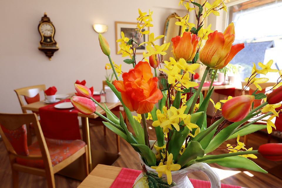 Von unserem Frühstücksraum haben Sie eine wunderschöne Aussicht auf Wiesen und Wälder. Morgens erwartet Sie ein reichhaltiges Frühstücksbüffet, das neben verschiedenen selbst gebackenen Brotsorten, Brötchen und Kaffee auch Müsli, Quark und andere Leckereien bereithält.