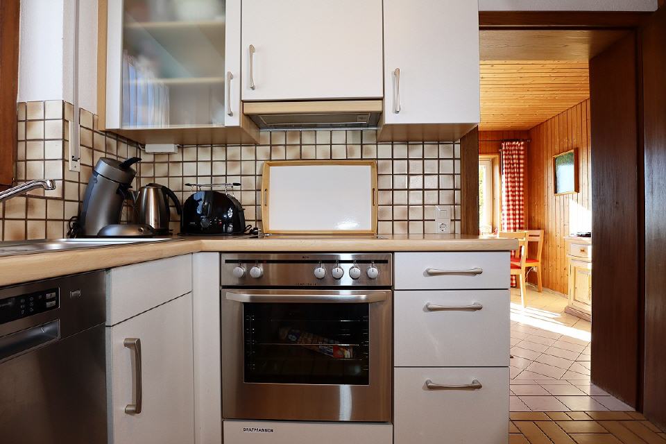 • moderne Küche (komplett eingerichtet mit Kaffeemaschine, Wasserkocher, 4-Feld-Glaskeramik-Herd, Mikrowelle, Backofen, Spülmaschine, Kühlschrank mit 3-Sterne-Gefrierfach)