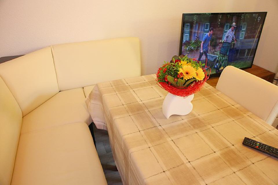 Ferienwohnung Hirschbühl. Das Einraum-Appartement hat eine Vorterrasse und hat einen ebenerdigen Zugang. Es ist optisch aufgeteilt in Schlafraum (Doppelbett, Kinderbett möglich), Wohnecke mit Schlafcouch, sowie Essplatz und kleiner Küchenblock. Das Bad ist mit WC und Dusche ausgestattet. Zur hellen Einrichtung gehören auch Sat-TV, Kühlschrank, Kaffeemaschine und ausreichend Geschirr. Durch die zentrale Lage ist ein Auto nicht erforderlich. Nichtraucherferienwohnung, 30 qm groß. Mindestaufenthalt 4 Nächte. Mögliche Belegung: 1 bis 3 Personen.