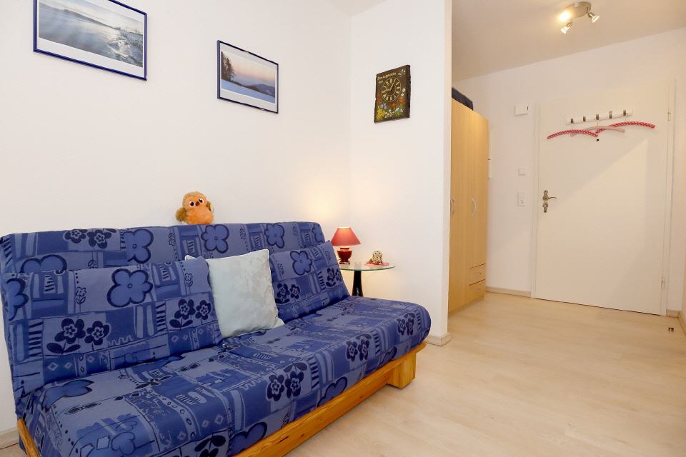 - Wohnbereich: Schlafsofa, Esstisch, TV Digital