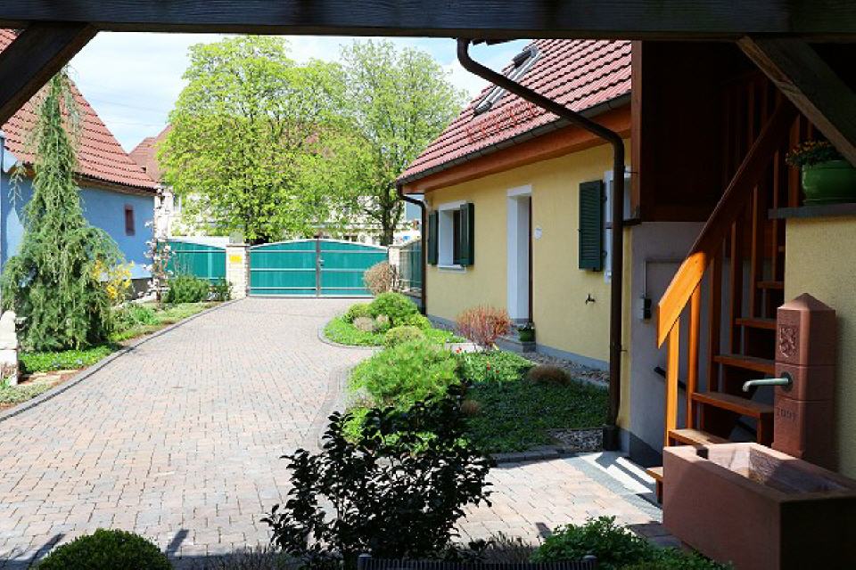 Der begrünte Innenhof mit Freisitz unter einer Weinreben-Pergola mit einem Brunnen und mit einer markanten Trockenmauer bieten Ruhe und Erholung.