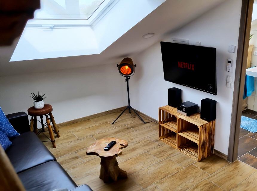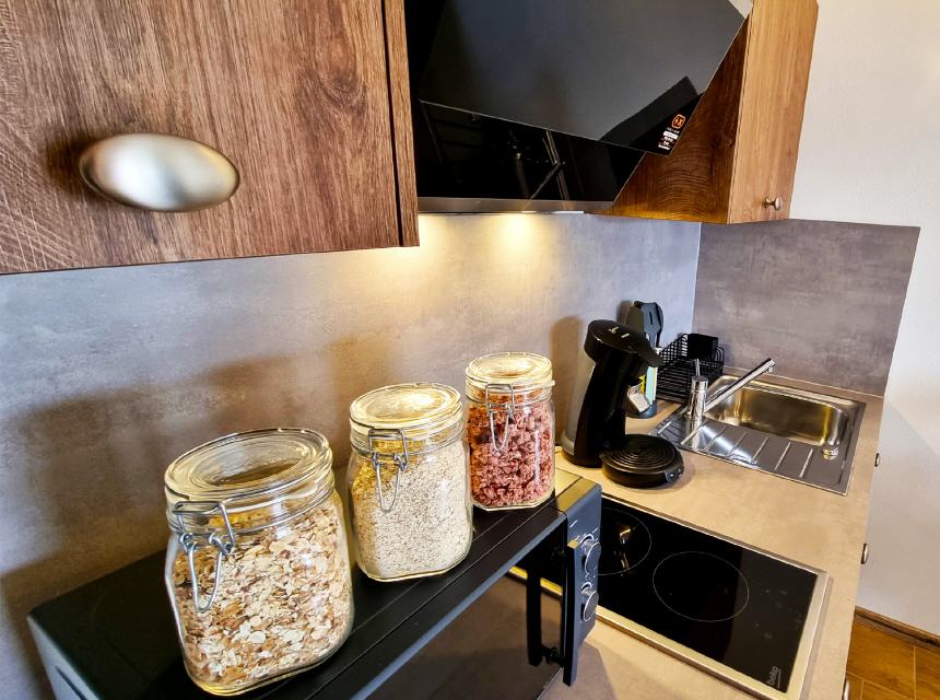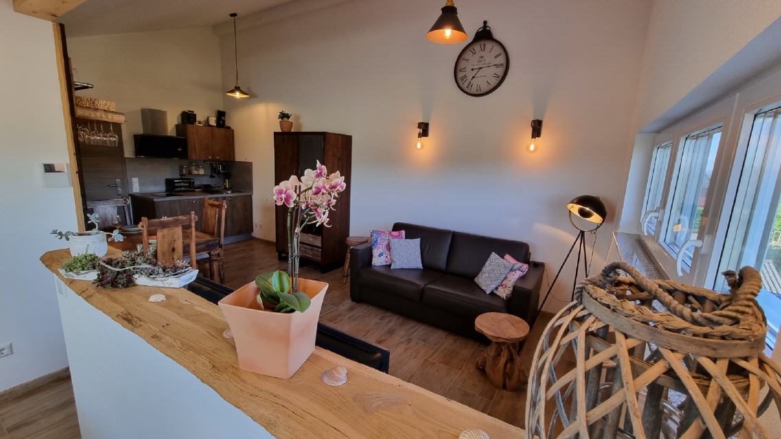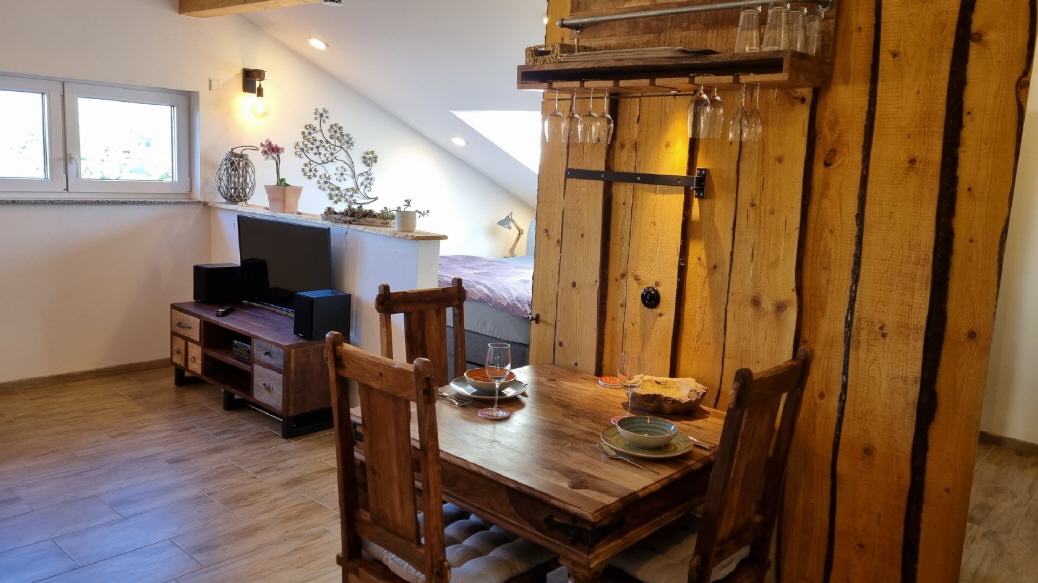 Ferienwohnung 1: geeignet für 2 Personen und 2 Kinder, 38 qm Wohnfläche, offener Wohn- / Koch- / Essbereich und Bad.